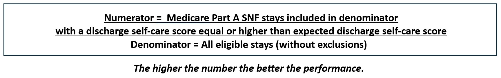 The numerator is the total number of SNF Medicare Part A stays, or Type 1 stays, in the denominator, with an observed discharge self-care score equal or higher than the calculated expected discharge self-care score. The observed discharge self-care score is calculated as follows: