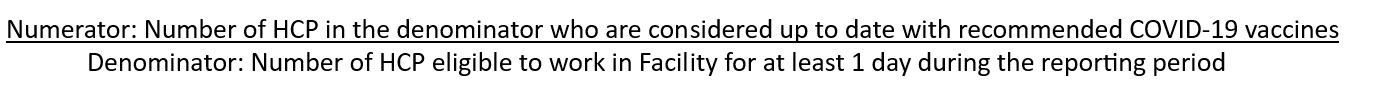 The two measures for HCP are National Healthcare Safety Network (NHSN), process measures. These measures look at the percentage of HCP who are up to date with recommended COVID-19 vaccines and Seasonal Influenza vaccines.